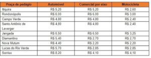 Os valores do pedágio da BR-163 vão ser reajustados pela Agência Nacional de Transportes Terrestres (ANTT), a partir da meia-noite desta segunda-feira (8). O aumento será no valor de 16,6% referente à atualização da inflação de 2018 a 2022.
